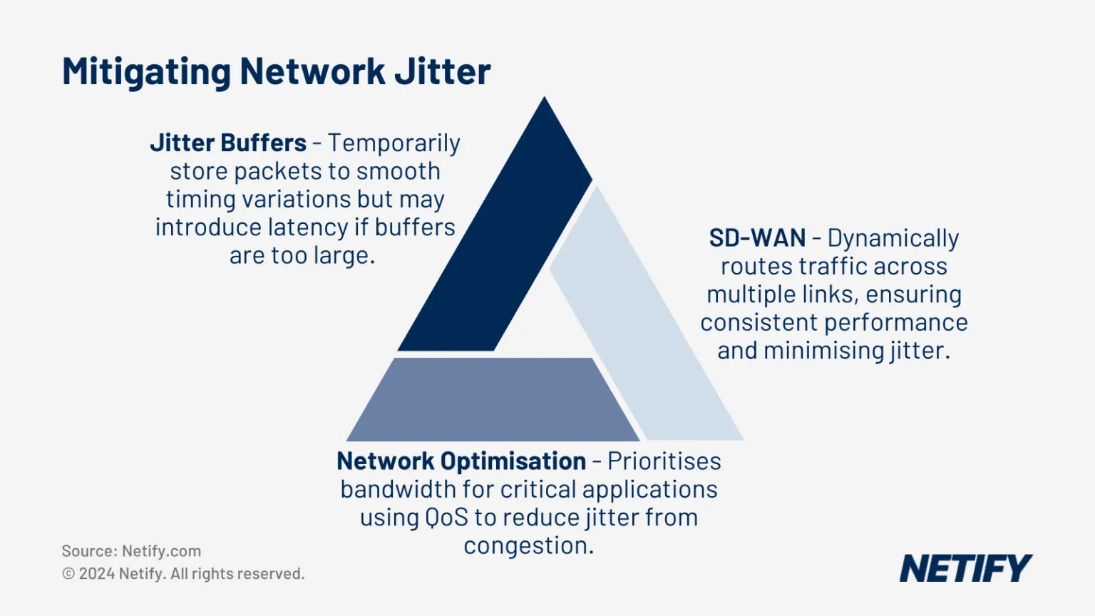 Jitter buffers can be utilised to temporarily store packets in a buffer, allowing for smoothing of packet timing variations where a packet is delayed or missed. This can reduce the impact of short-term jitter on real-time applications like VoIP and video streaming. Unfortunately, this is often seen as a short term fix as introducing a larger buffer can introduce latency, whilst shorter buffers reduce the amount of jitter the buffer can compensate for.