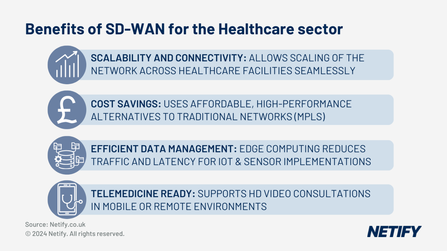 Adapting to the increasing use of Internet of Things (IoT) devices and artificial intelligence (AI) in healthcare, requires networks to be scalable. SD-WAN meets this infrastructural requirement, easily integrating IoT devices and helps to support AI appl