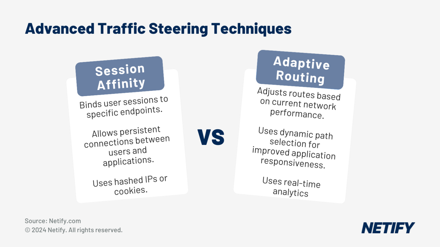 There are two main types of advanced traffic steering techniques: Session Affinity and Adaptive Routing.
